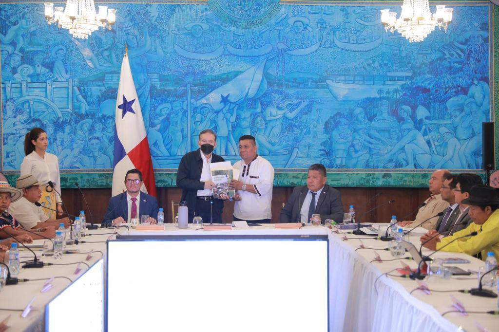 Durante este encuentro en el Salón Paz de la Presidencia de la República, el mandatario recibió el Plan de Desarrollo de las 7 comarcas y 12 territorios indígenas y conversó con las autoridades tradicionales sobre temas como medio ambiente, cambio climático y seguridad territorial, entre otros