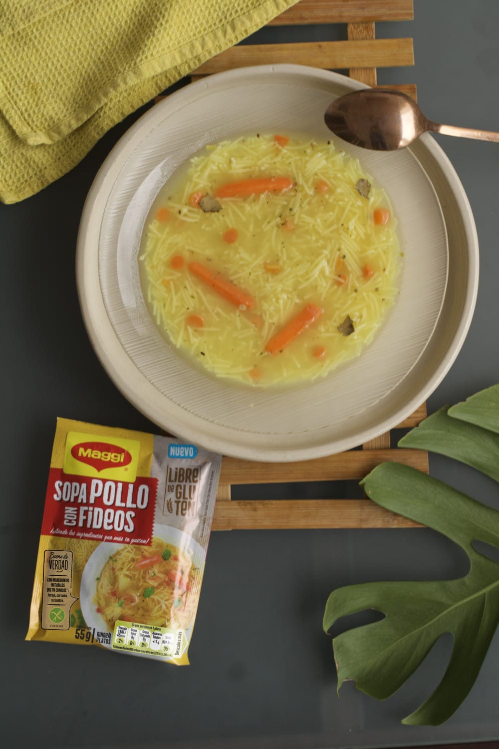 Verifique la certificación sin gluten: Muchas organizaciones ofrecen certificaciones que validan que el producto es libre de esta proteína. En el caso de la Sopa de Pollo con Fideos Maggi, podrá identificarla con el logo de la certificación, que es una ramita de trigo color verde en la parte frontal de los empaques.