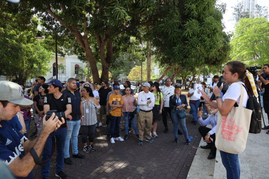 La Arquitecta Itzela Quirós, subdirectora nacional de Patrimonio Cultural de MiCultura fue la encargada de instruir a los presentes sobre los datos de los diversos puntos visitados, como el de la Alianza Francesa, el primero en apreciar, seguido del edificio Chiqui y la Escuela Bella Vista.